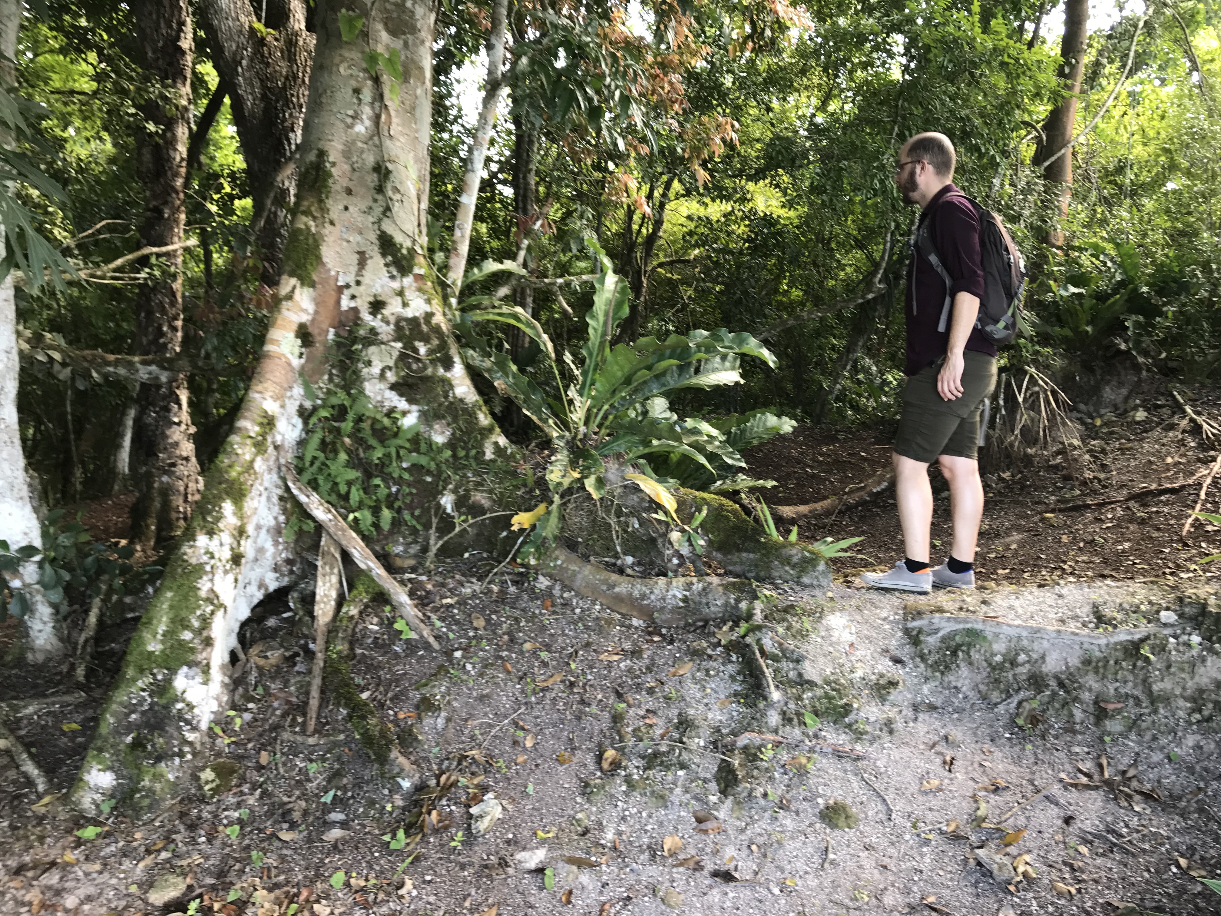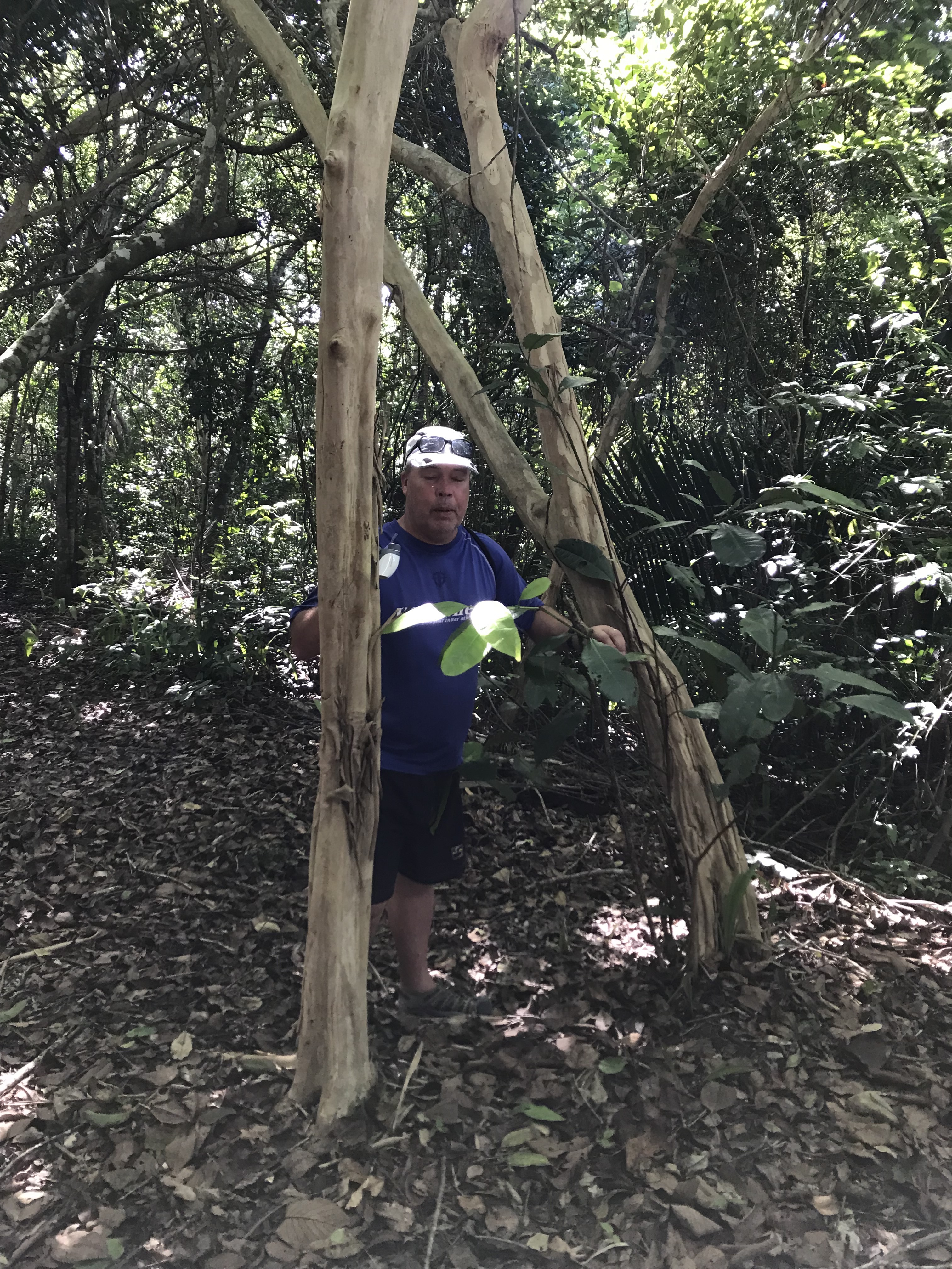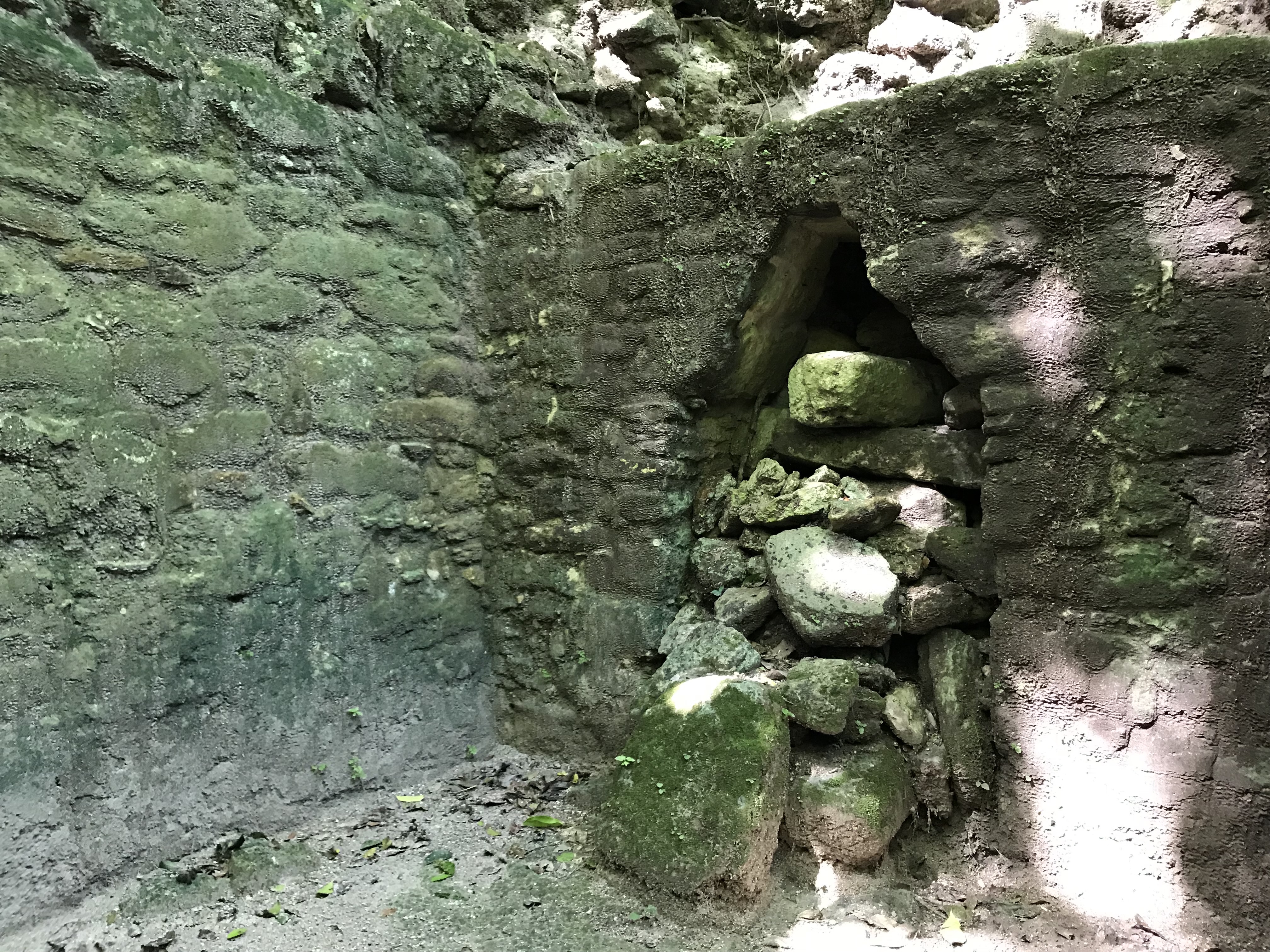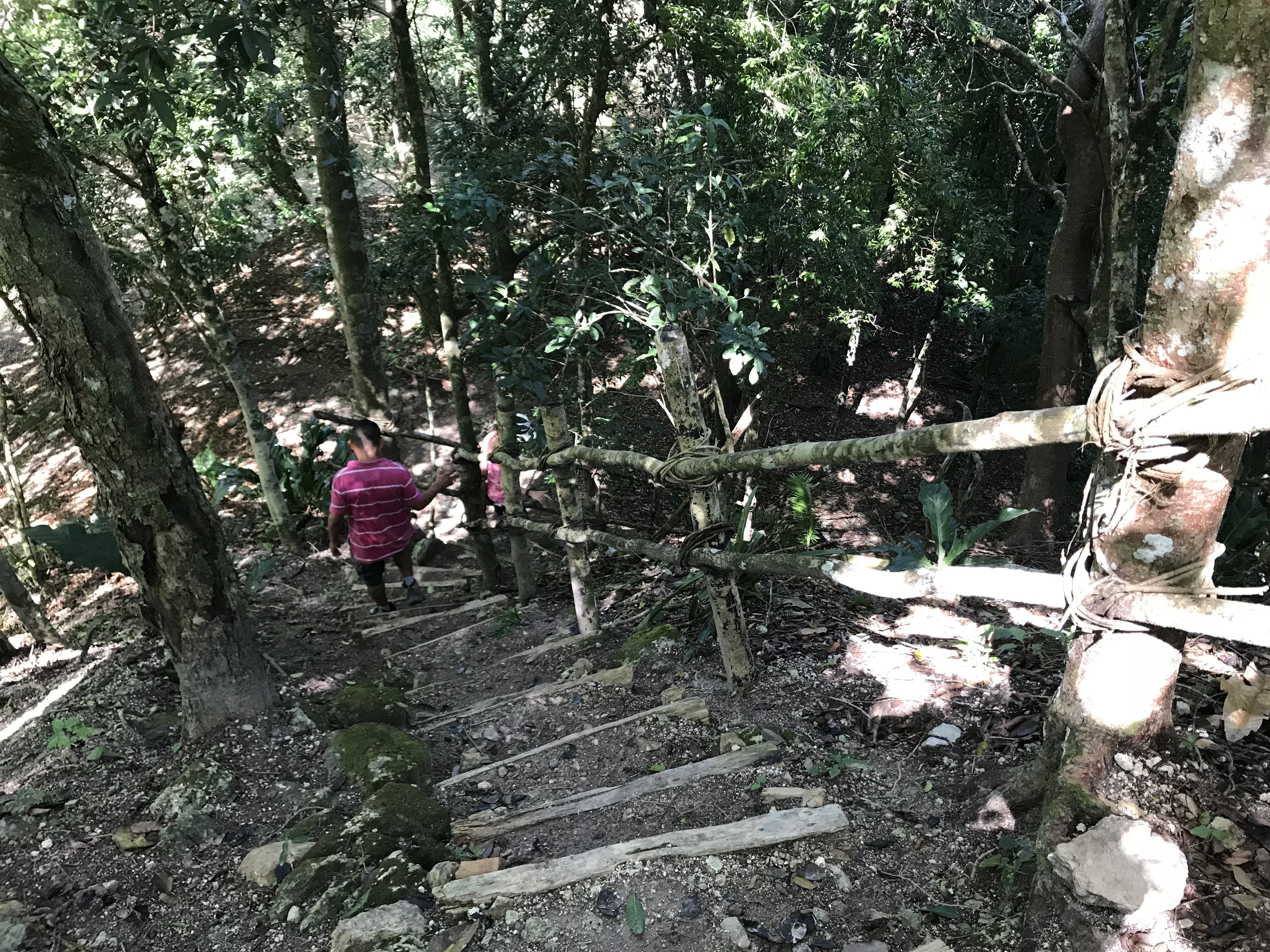 Getting tired and weary, we decided to head back and stop in at some sights we passed along the way, as the initial objective this morning was to find The Blue Temple! We started to head back, and were admiring the short reddish groves along the way: a young pineapple field in the hillside. while heading back, we also could not resist pulling over and crossing a river stream on a rickety bridge to a large white impressive Buddha: probably 50 feet tall, and we were the only ones there at the site. Also found some go-carts and merry-go-round pieces, so looks like there are plans to create a festive plaza nearby. Our final stop/distraction was at a cave temple that had statues carved into the rocks themselves. Looking fairly abandon, we approached and climbed the staircase into the vaults holding more buddhas – no power at this site, and lots of dust on the floor: we found out later this was Wat Tham Tu Pu that is maintained by a solitary monk, and his cats.