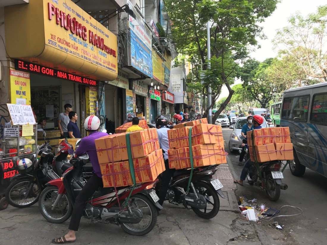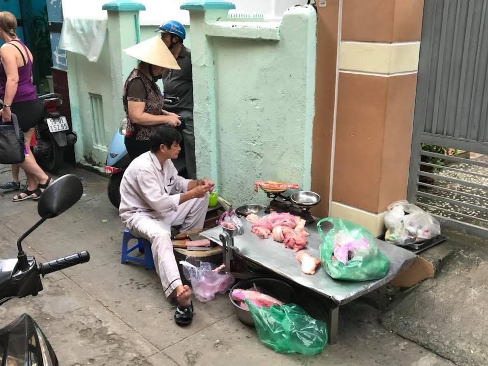 As evening approached, the sunset and boats on the Mekong river once again came to life – tourist dinner boats and some if the waterfront walkways are very scenic! Off to dinner at our favorite local Pho shop recommended by our hotel, and highly recommended in Lonely planet as well. The soups are stunning, and huge trays of fresh vegetables: mint, cilantro, sprouts, and Chinese greens are all mixed into the spicy soup for an epic an fresh meal. Tourists are combined into a single table in the corner, and the place is teeming with locals having large loud festive gatherings. Touring town, stalls are setup everywhere and selling cloths, food, and other goods. I picked up a 50,000 Dong watch to replace my failed FitBit for now. Love seeing the family scooter outing.